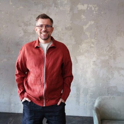 Men's linen bomber jacket with patch pockets. Color in the picture – Terracotta. This jacket is made from 100% Linen