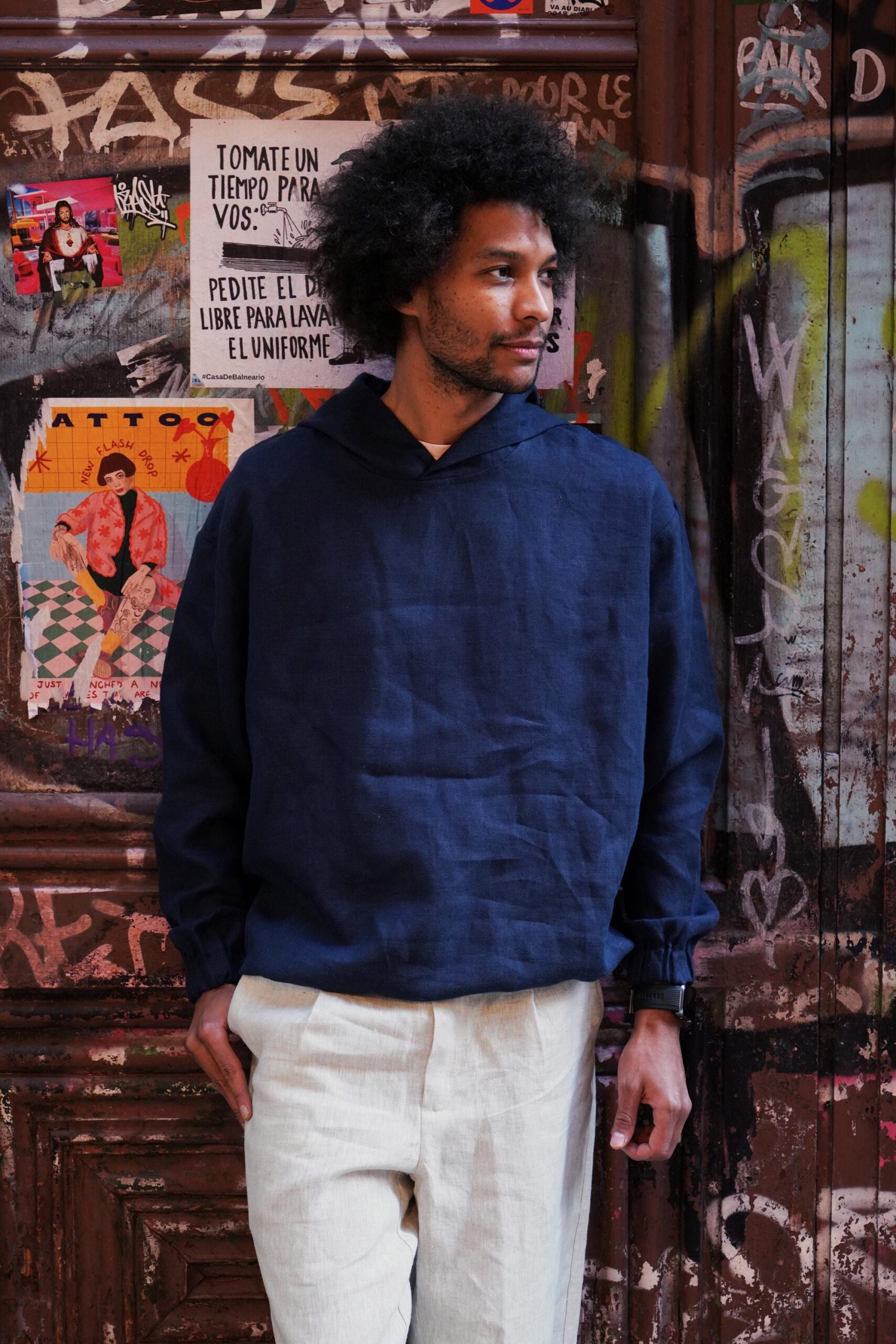 We've been thinking for a long time about creating a baggy linen hoodie that will look like a garment made of thick fabrics. Finally, we are ready to present our hoodie with a tie on bottom that creates a stylish baggy look and it's still linen:)