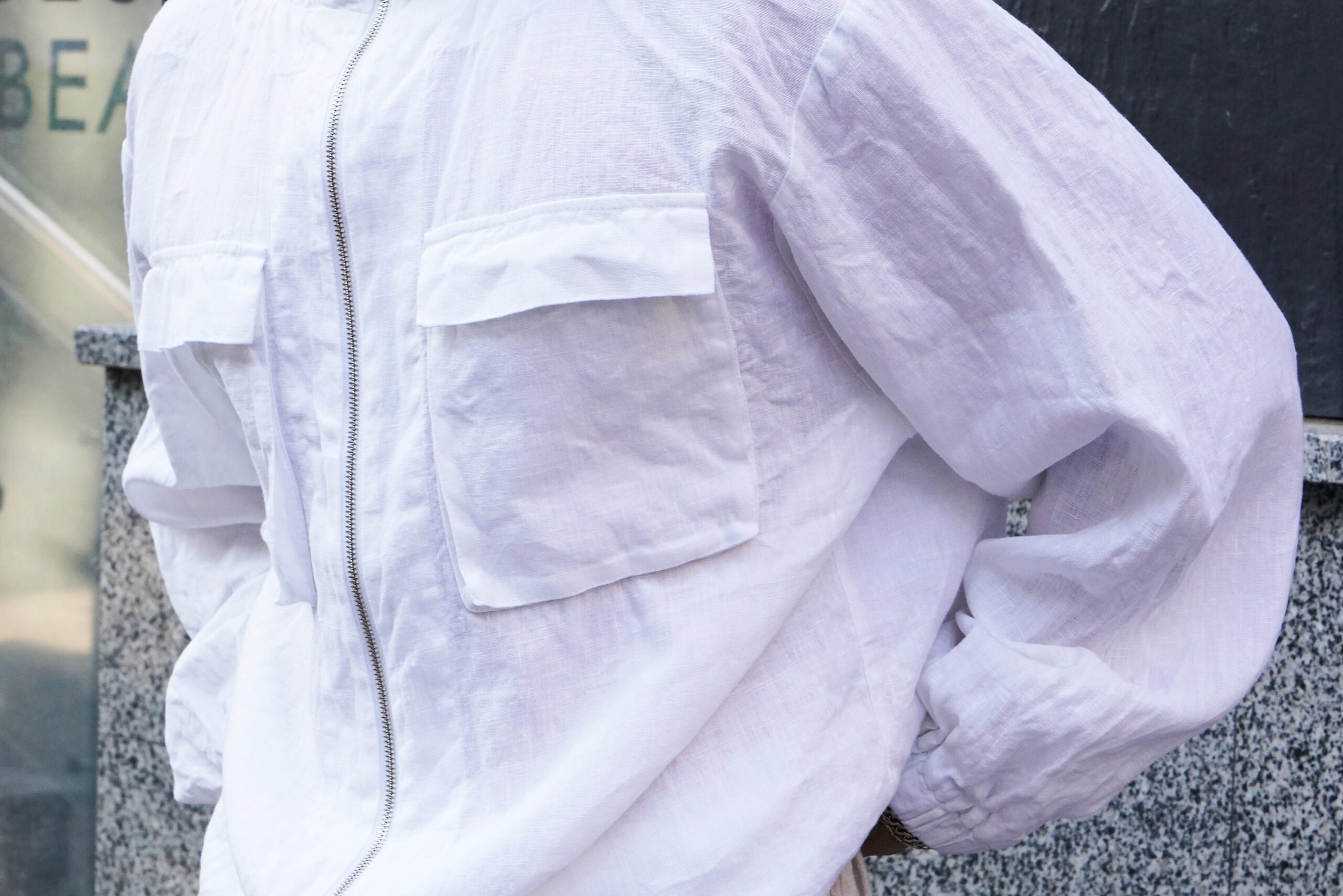 This jacket is made from 100% Linen and is available in a variety of colors.