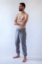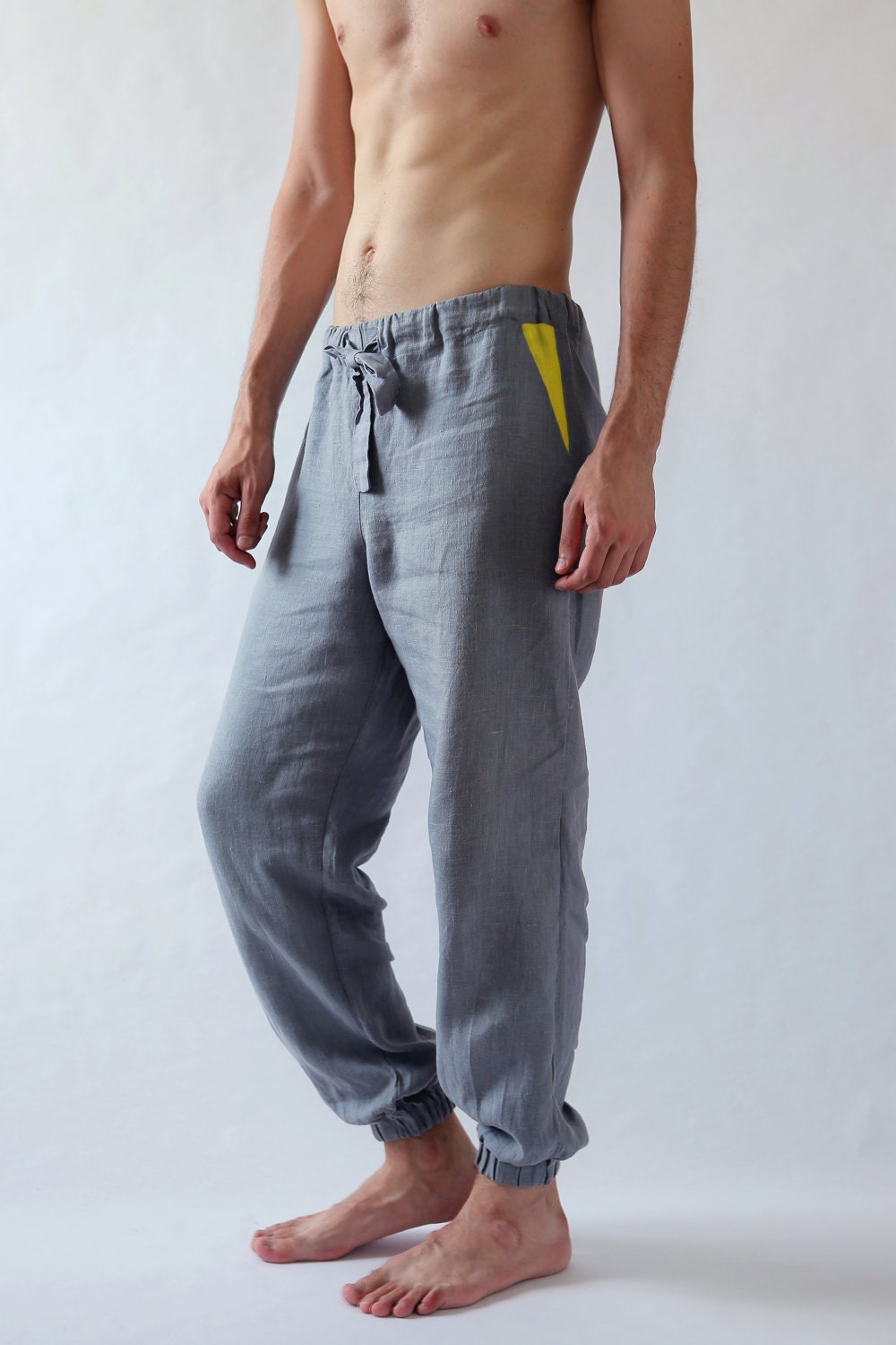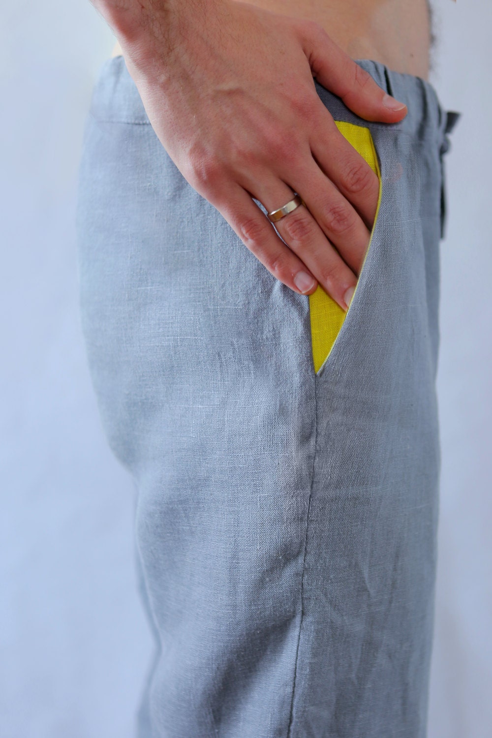 Natural men's linen pants. Grey pants with yellow pockets.
