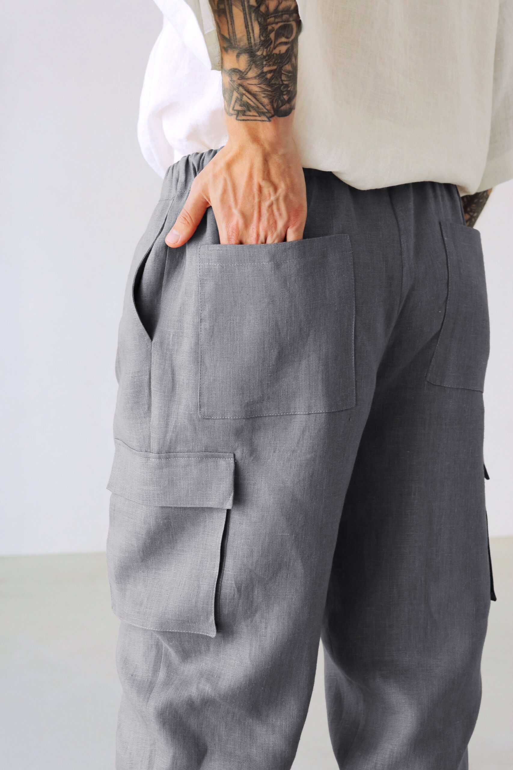 Loose-fit cargo pants are made from 100% Linen and available in a variety of colors.